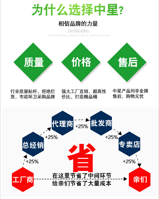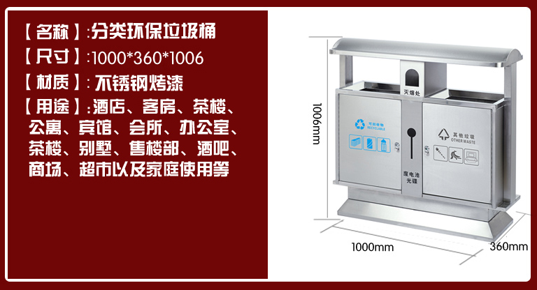 【品名】三分類垃圾桶  【品牌】 中星  【材質(zhì)】?jī)?yōu)質(zhì)鍍鋅板  【內(nèi)膽】鍍鋅板、不銹鋼  【制作工藝】選用優(yōu)質(zhì)不銹鋼鋼板裁剪、壓制、折彎后再焊接而成型  【噴涂工藝】垃圾桶經(jīng)磷化噴砂處理后采用戶...