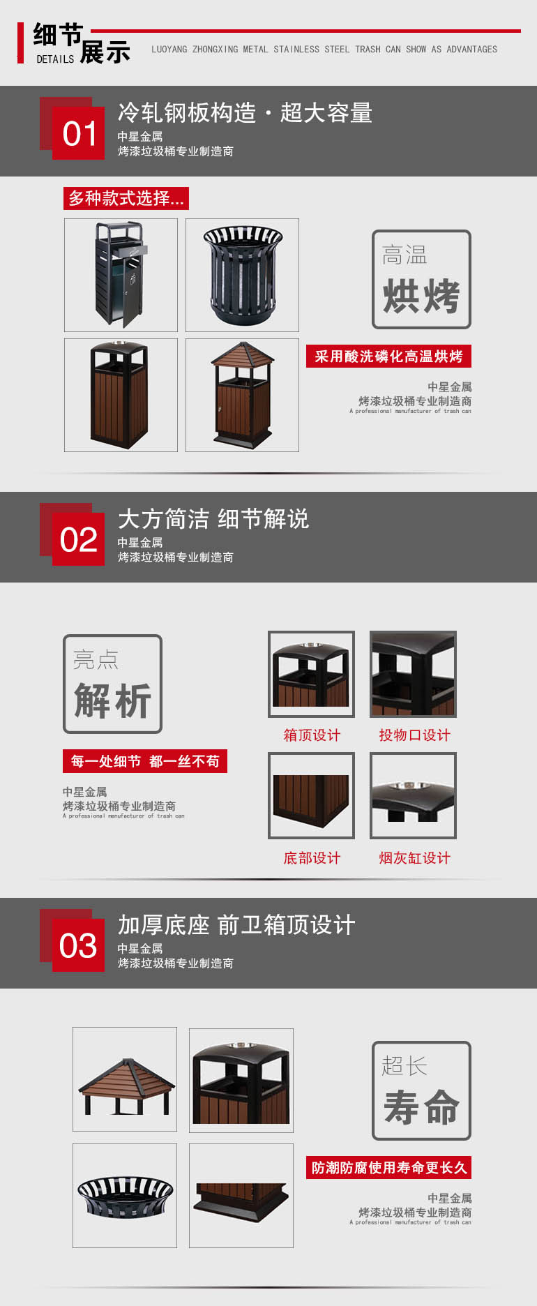 【品名】三分類垃圾桶  【品牌】 中星  【材質(zhì)】?jī)?yōu)質(zhì)鍍鋅板  【內(nèi)膽】鍍鋅板、不銹鋼  【制作工藝】選用優(yōu)質(zhì)不銹鋼鋼板裁剪、壓制、折彎后再焊接而成型  【噴涂工藝】垃圾桶經(jīng)磷化噴砂處理后采用戶...
