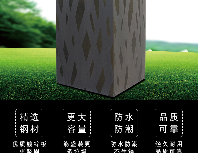 【品名】三分類垃圾桶 【品牌】 中星 【材質(zhì)】優(yōu)質(zhì)鍍鋅板 【內(nèi)膽】鍍鋅板、不銹鋼 【制作工藝】選用優(yōu)質(zhì)不銹鋼鋼板裁剪、壓制、折彎后再焊接而成型 【噴涂工藝】垃圾桶經(jīng)磷化噴砂處理后采用戶...