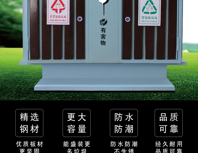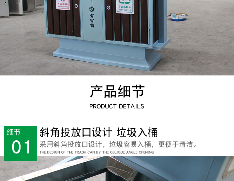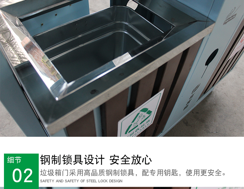 【品名】三分類垃圾桶 【品牌】 中星 【材質(zhì)】優(yōu)質(zhì)鍍鋅板 【內(nèi)膽】鍍鋅板、不銹鋼 【制作工藝】選用優(yōu)質(zhì)不銹鋼鋼板裁剪、壓制、折彎后再焊接而成型 【噴涂工藝】垃圾桶經(jīng)磷化噴砂處理后采用戶...