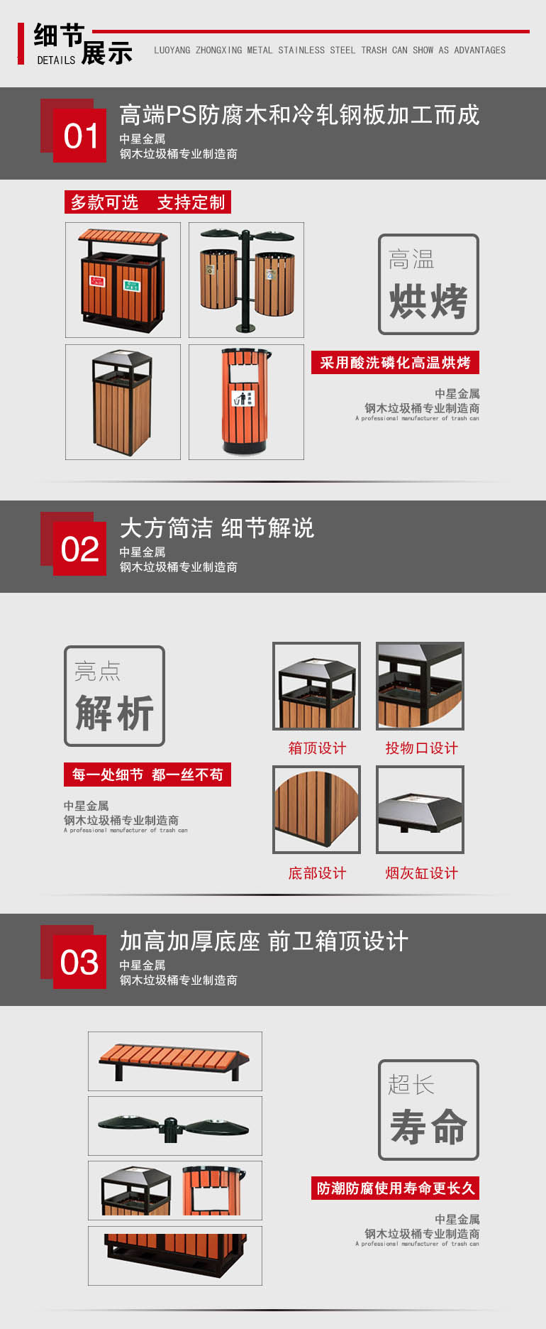 【品名】三分類垃圾桶  【品牌】 中星  【材質(zhì)】?jī)?yōu)質(zhì)鍍鋅板  【內(nèi)膽】鍍鋅板、不銹鋼  【制作工藝】選用優(yōu)質(zhì)不銹鋼鋼板裁剪、壓制、折彎后再焊接而成型  【噴涂工藝】垃圾桶經(jīng)磷化噴砂處理后采用戶...