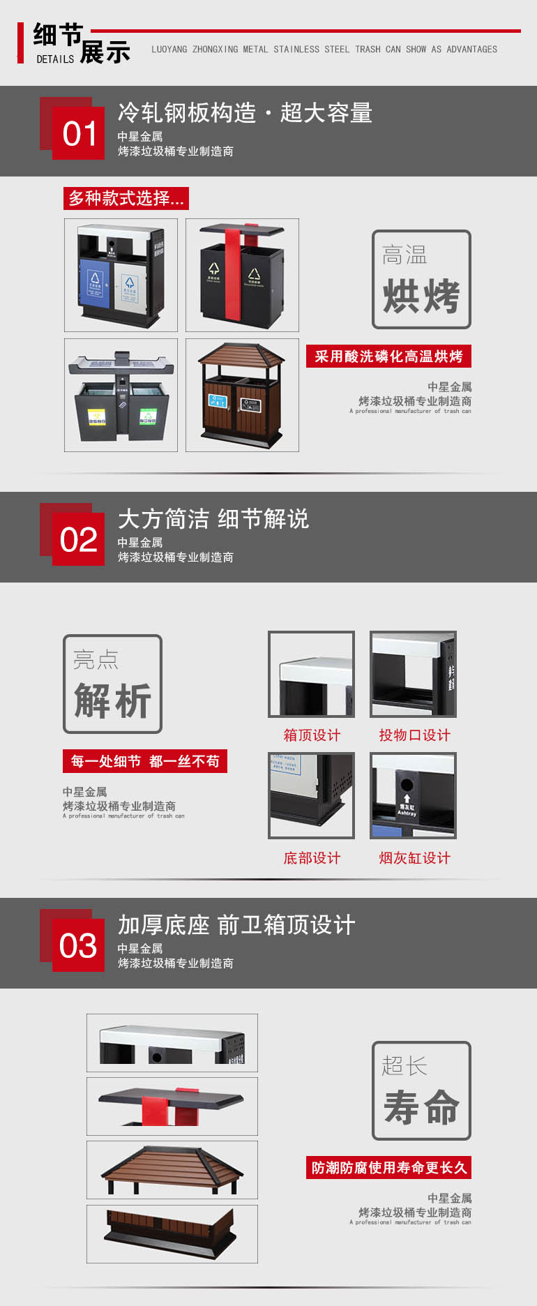 【品名】三分類垃圾桶  【品牌】 中星  【材質(zhì)】?jī)?yōu)質(zhì)鍍鋅板  【內(nèi)膽】鍍鋅板、不銹鋼  【制作工藝】選用優(yōu)質(zhì)不銹鋼鋼板裁剪、壓制、折彎后再焊接而成型  【噴涂工藝】垃圾桶經(jīng)磷化噴砂處理后采用戶...
