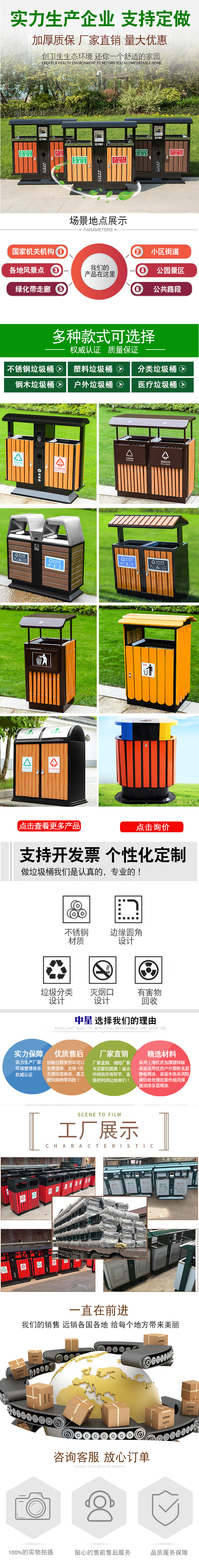 【品名】三分類垃圾桶  【品牌】 中星  【材質(zhì)】?jī)?yōu)質(zhì)鍍鋅板  【內(nèi)膽】鍍鋅板、不銹鋼  【制作工藝】選用優(yōu)質(zhì)不銹鋼鋼板裁剪、壓制、折彎后再焊接而成型  【噴涂工藝】垃圾桶經(jīng)磷化噴砂處理后采用戶...