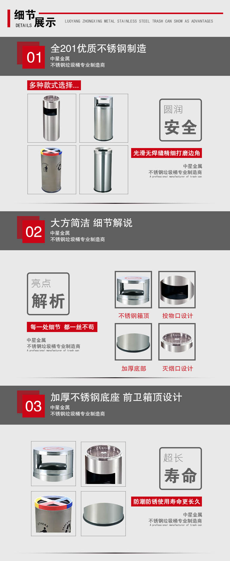 【品名】三分類垃圾桶  【品牌】 中星  【材質(zhì)】優(yōu)質(zhì)鍍鋅板  【內(nèi)膽】鍍鋅板、不銹鋼  【制作工藝】選用優(yōu)質(zhì)不銹鋼鋼板裁剪、壓制、折彎后再焊接而成型  【噴涂工藝】垃圾桶經(jīng)磷化噴砂處理后采用戶...