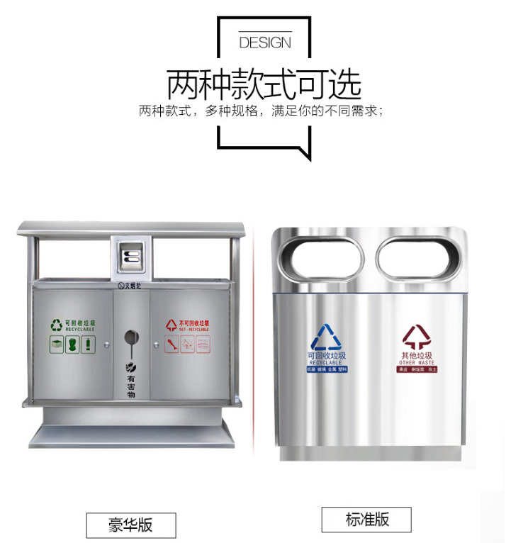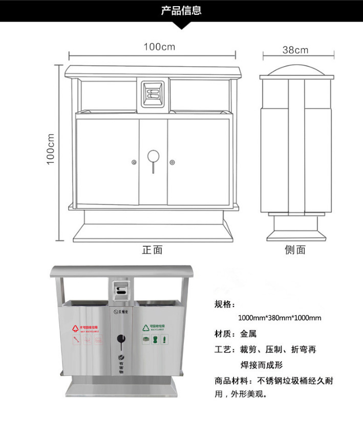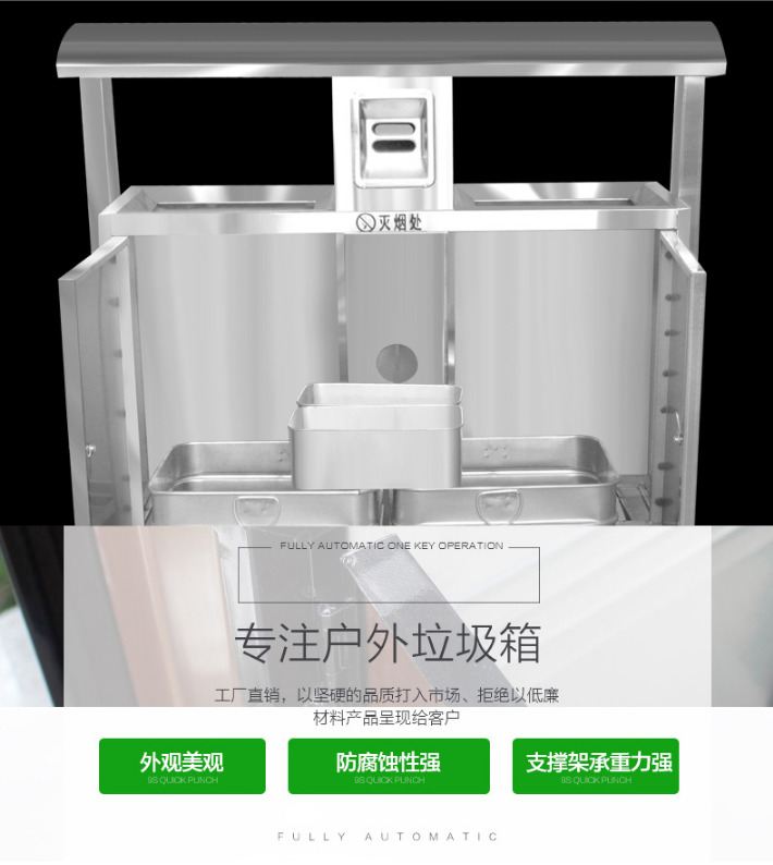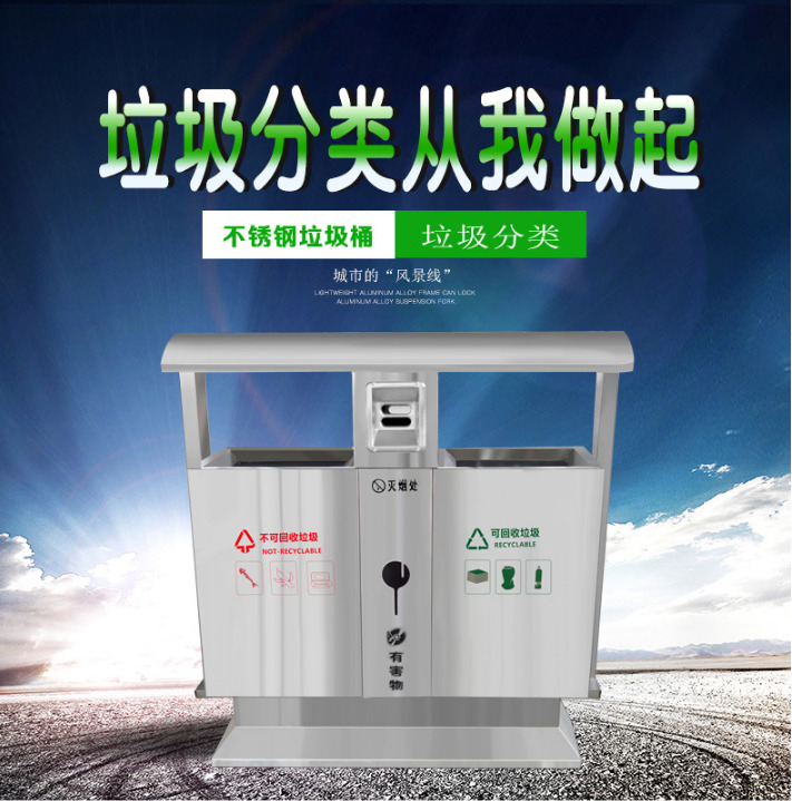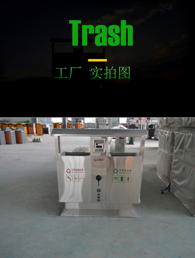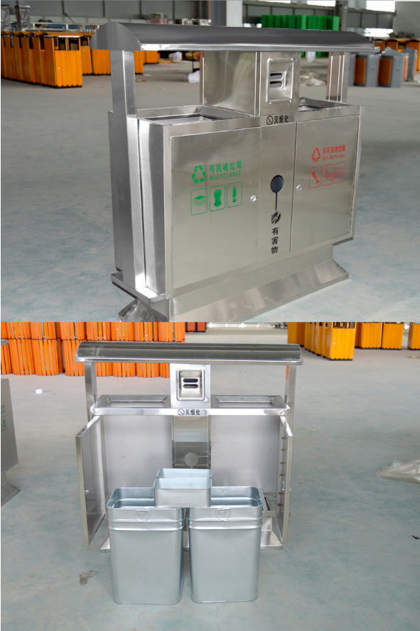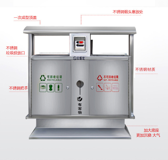 【品名】三分類垃圾桶  【品牌】 中星  【材質(zhì)】優(yōu)質(zhì)鍍鋅板  【內(nèi)膽】鍍鋅板、不銹鋼  【制作工藝】選用優(yōu)質(zhì)不銹鋼鋼板裁剪、壓制、折彎后再焊接而成型  【噴涂工藝】垃圾桶經(jīng)磷化噴砂處理后采用戶...
