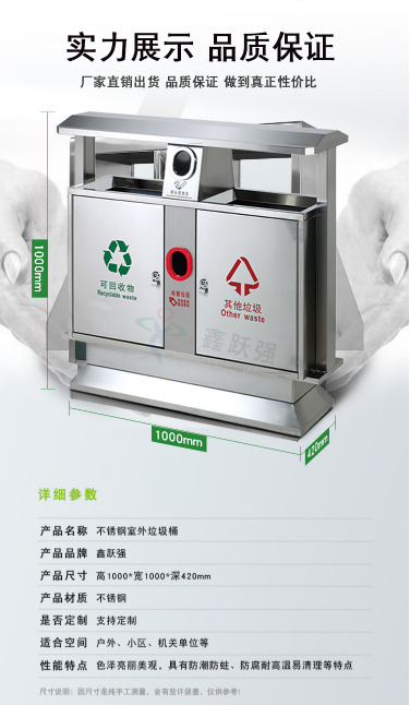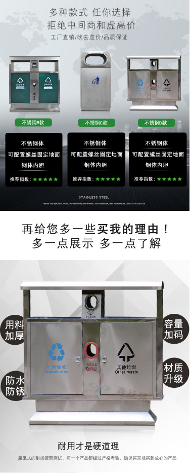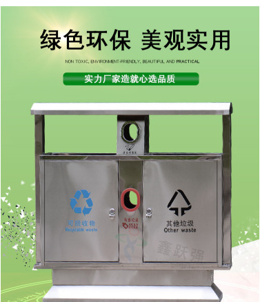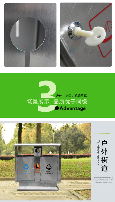 【品名】三分類垃圾桶 【品牌】 中星 【材質(zhì)】優(yōu)質(zhì)鍍鋅板 【內(nèi)膽】鍍鋅板、不銹鋼 【制作工藝】選用優(yōu)質(zhì)不銹鋼鋼板裁剪、壓制、折彎后再焊接而成型 【噴涂工藝】垃圾桶經(jīng)磷化噴砂處理后采用戶...
