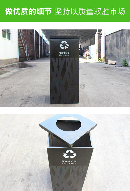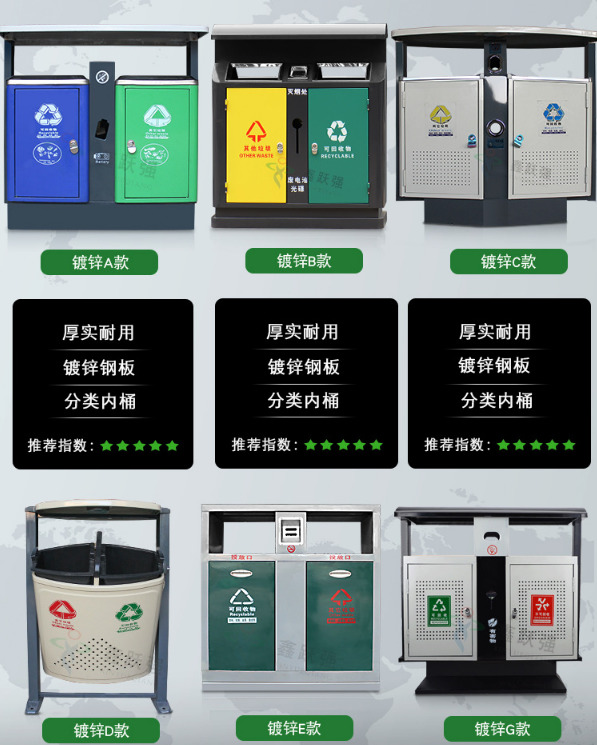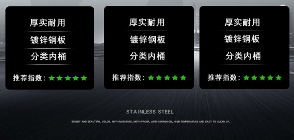【品名】三分類垃圾桶 【品牌】 中星 【材質(zhì)】?jī)?yōu)質(zhì)鍍鋅板 【內(nèi)膽】鍍鋅板、不銹鋼 【制作工藝】選用優(yōu)質(zhì)不銹鋼鋼板裁剪、壓制、折彎后再焊接而成型 【噴涂工藝】垃圾桶經(jīng)磷化噴砂處理后采用戶...