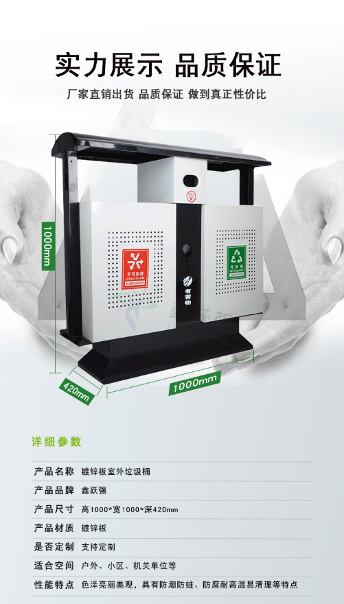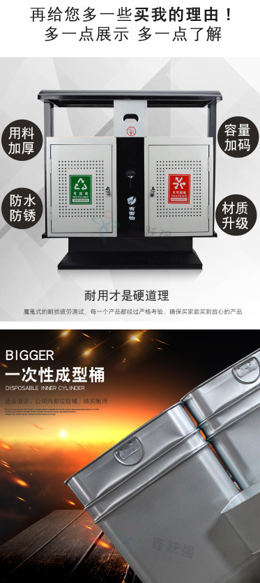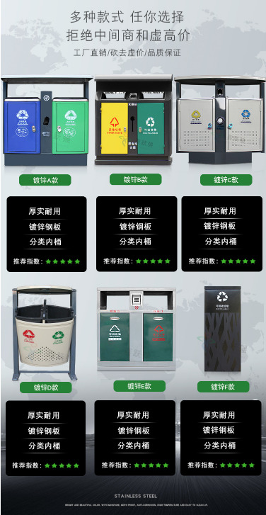 【品名】三分類垃圾桶  【品牌】 中星  【材質(zhì)】優(yōu)質(zhì)鍍鋅板  【內(nèi)膽】鍍鋅板、不銹鋼  【制作工藝】選用優(yōu)質(zhì)不銹鋼鋼板裁剪、壓制、折彎后再焊接而成型  【噴涂工藝】垃圾桶經(jīng)磷化噴砂處理后采用戶...