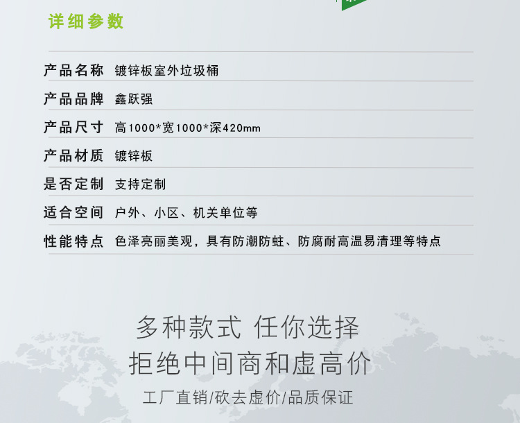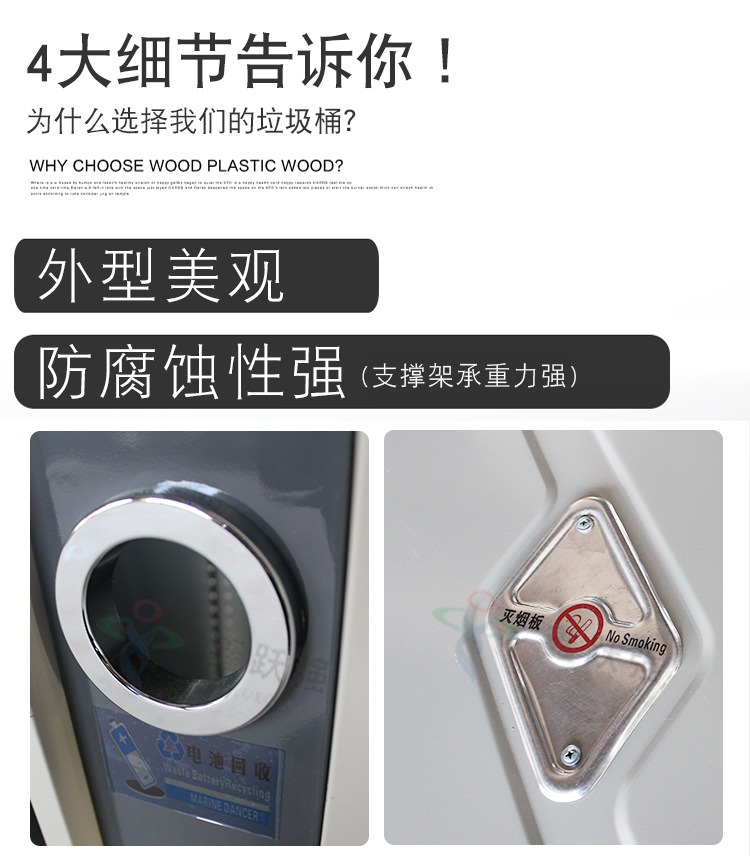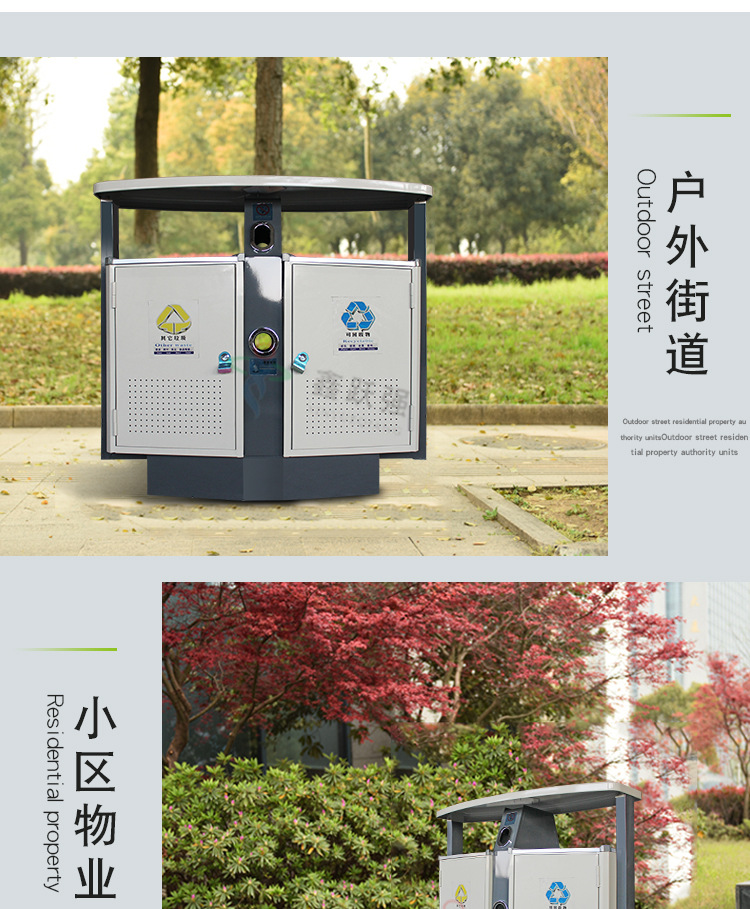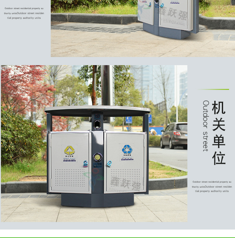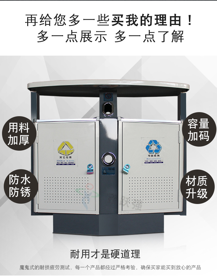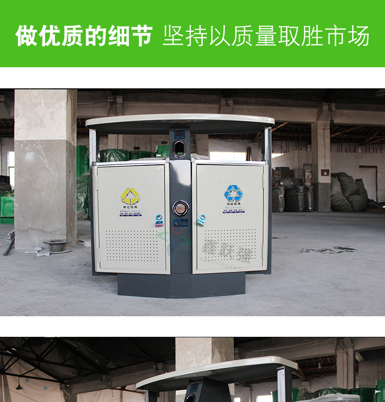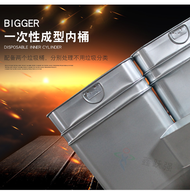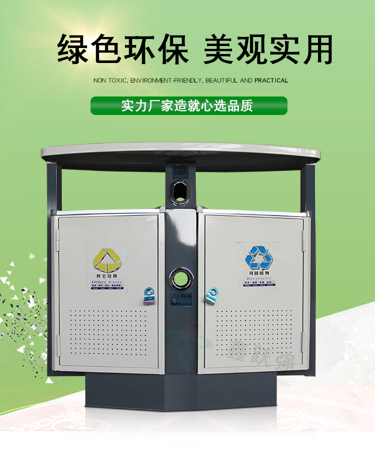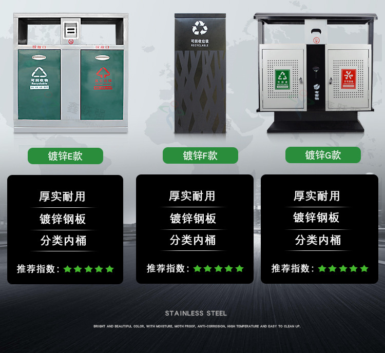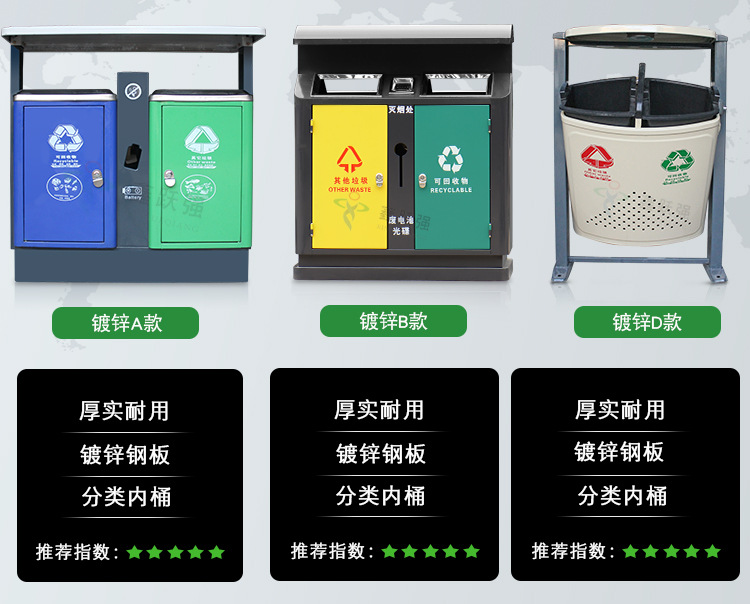 【品名】三分類垃圾桶 【品牌】 中星 【材質(zhì)】?jī)?yōu)質(zhì)鍍鋅板 【內(nèi)膽】鍍鋅板、不銹鋼 【制作工藝】選用優(yōu)質(zhì)不銹鋼鋼板裁剪、壓制、折彎后再焊接而成型 【噴涂工藝】垃圾桶經(jīng)磷化噴砂處理后采用戶...