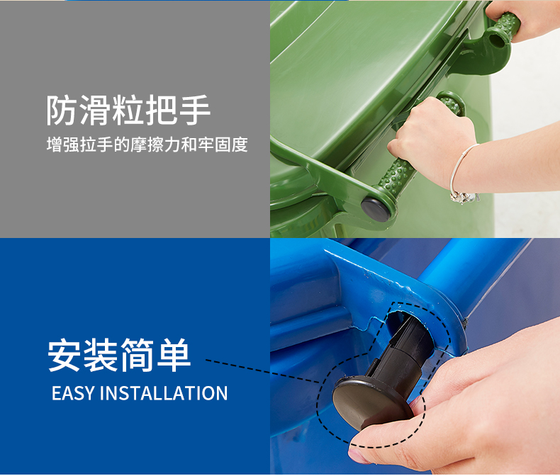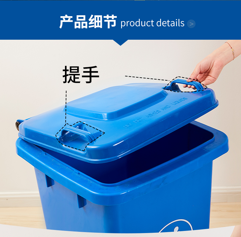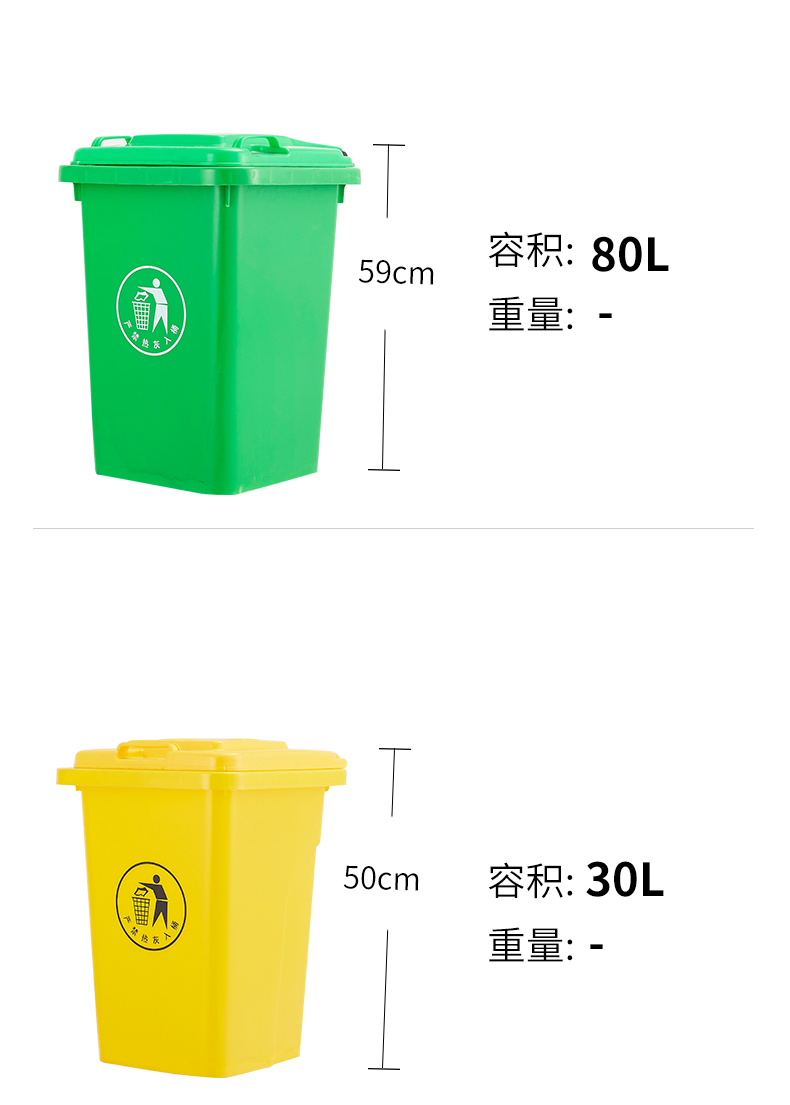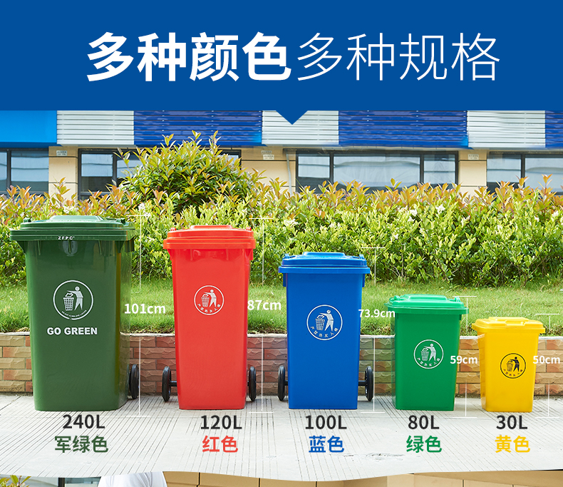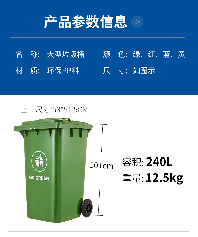 產(chǎn)品名稱 660升塑料垃圾桶 產(chǎn)品型號 ZX-660L 產(chǎn)品顏色 綠色/灰色/藍色/黃色/紅色 外桶材質(zhì) 聚乙 內(nèi)桶材質(zhì) 聚乙烯 容量 660L 建議使用場景 街...