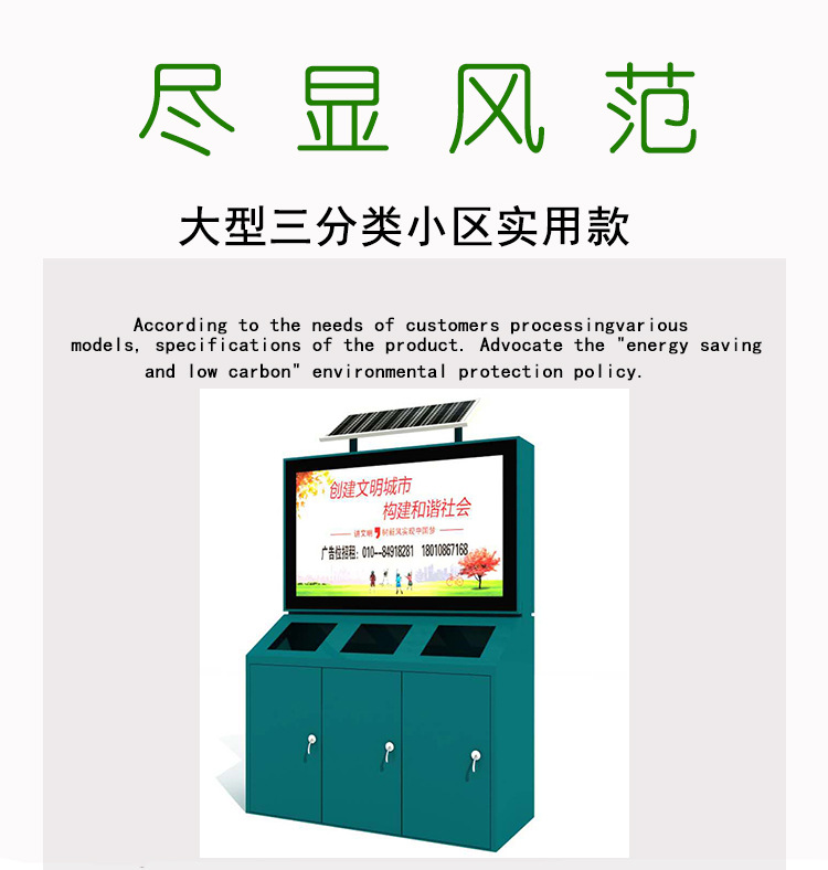 【品名】三分類垃圾桶 【品牌】 中星 【材質(zhì)】優(yōu)質(zhì)鍍鋅板 【內(nèi)膽】鍍鋅板、不銹鋼 【制作工藝】選用優(yōu)質(zhì)不銹鋼鋼板裁剪、壓制、折彎后再焊接而成型 【噴涂工藝】垃圾桶經(jīng)磷化噴砂處理后采用戶...