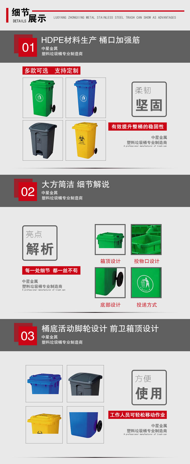 產(chǎn)品名稱 660升塑料垃圾桶 產(chǎn)品型號 ZX-660L 產(chǎn)品顏色 綠色/灰色/藍(lán)色/黃色/紅色 外桶材質(zhì) 聚乙 內(nèi)桶材質(zhì) 聚乙烯 容量 660L 建議使用場景 街...