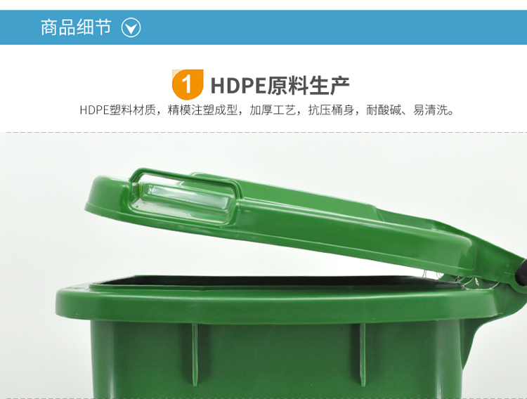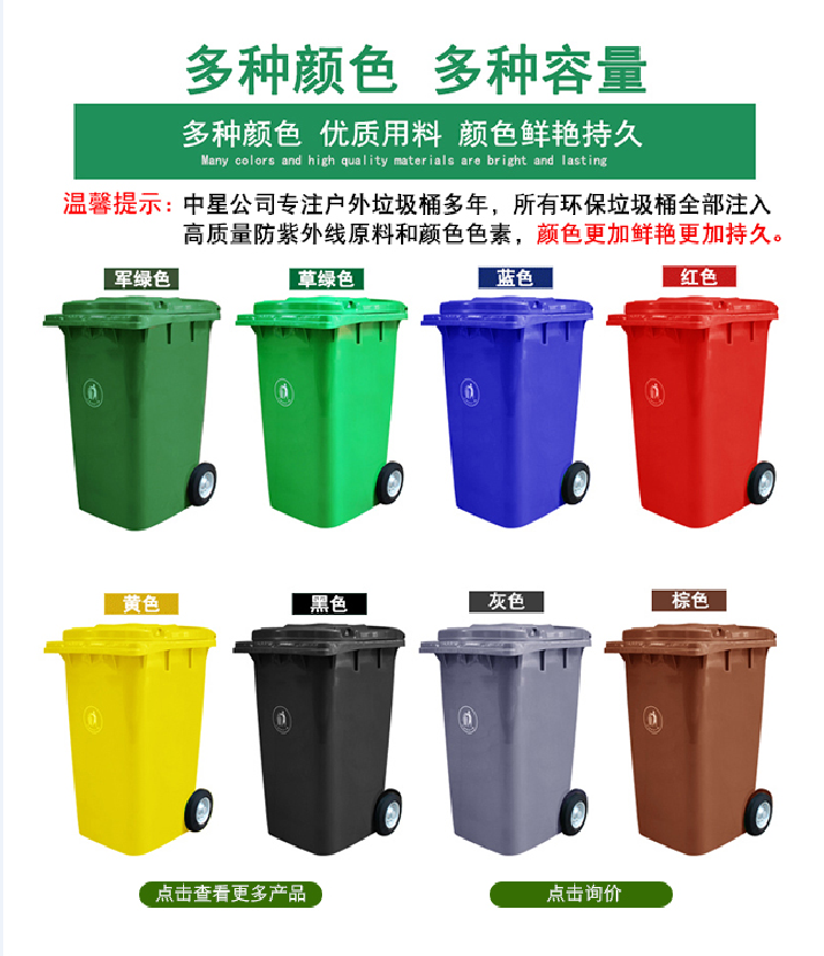 產(chǎn)品名稱 660升塑料垃圾桶 產(chǎn)品型號 ZX-660L 產(chǎn)品顏色 綠色/灰色/藍色/黃色/紅色 外桶材質(zhì) 聚乙 內(nèi)桶材質(zhì) 聚乙烯 容量 660L 建議使用場景 街...